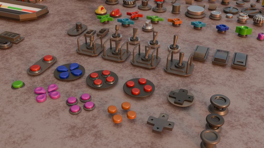 This pack includes a wide variety of modular panel parts—buttons, switches, knobs, joysticks, dials, and more—perfect for crafting complex sci-fi dashboards, cockpits, machinery, or control rooms.
